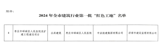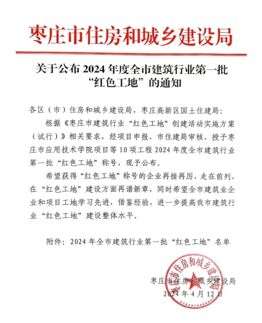 近日,棗莊市住房和城鄉(xiāng)建設(shè)局公布了2024年全市建筑行業(yè)第一批“紅色工地”名單,由公司承建的棗莊市嶧城區(qū)人民醫(yī)院改擴(kuò)建工程建設(shè)項目榮獲2024年度棗莊市建筑行業(yè)第一批“紅色工地”稱號。