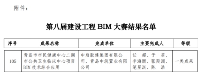 近日,中國建筑業(yè)協(xié)會發(fā)文公布了第八屆建設(shè)工程BIM大賽結(jié)果名單,我公司承建的青島市市民健康中心二期市公共衛(wèi)生臨床中心項(xiàng)目榮獲“一類成果”佳績。