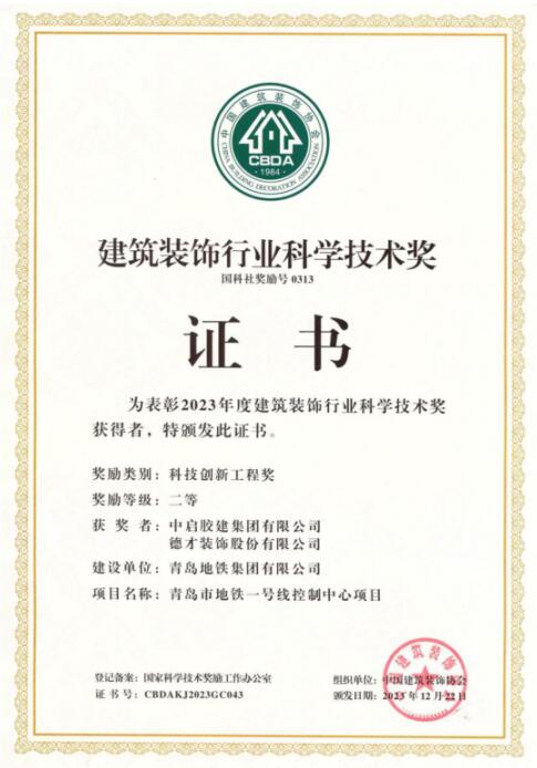 12月15日,中國建筑裝飾協(xié)會公布了2023年度中國建筑裝飾行業(yè)科學(xué)技術(shù)獎獲獎名單。由中啟膠建集團(tuán)膠州公司建設(shè)的青島市地鐵一號線控制中心項目榮獲中國建筑裝飾行業(yè)科學(xué)技術(shù)獎(科技創(chuàng)新工程獎)二等獎。這是我公司首次獲得該獎項,創(chuàng)中啟膠建集團(tuán)技術(shù)創(chuàng)新領(lǐng)域的先河。