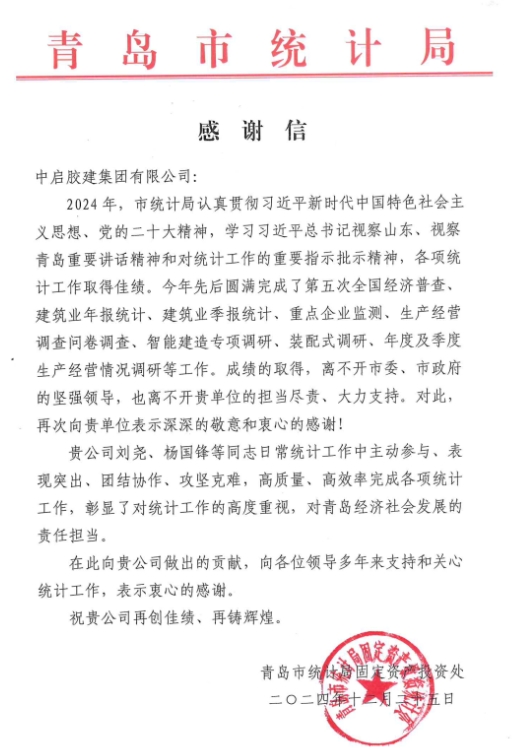 青島市統(tǒng)計局特向公司發(fā)來感謝信,對公司在統(tǒng)計工作中擔(dān)當(dāng)盡責(zé)、大力支持所做出的貢獻表示感謝,并對公司相關(guān)同志在日常統(tǒng)計工作中主動參與、表現(xiàn)突出、團結(jié)協(xié)作、攻堅克難,高質(zhì)量、高效率完成各項統(tǒng)計工作提出表揚。