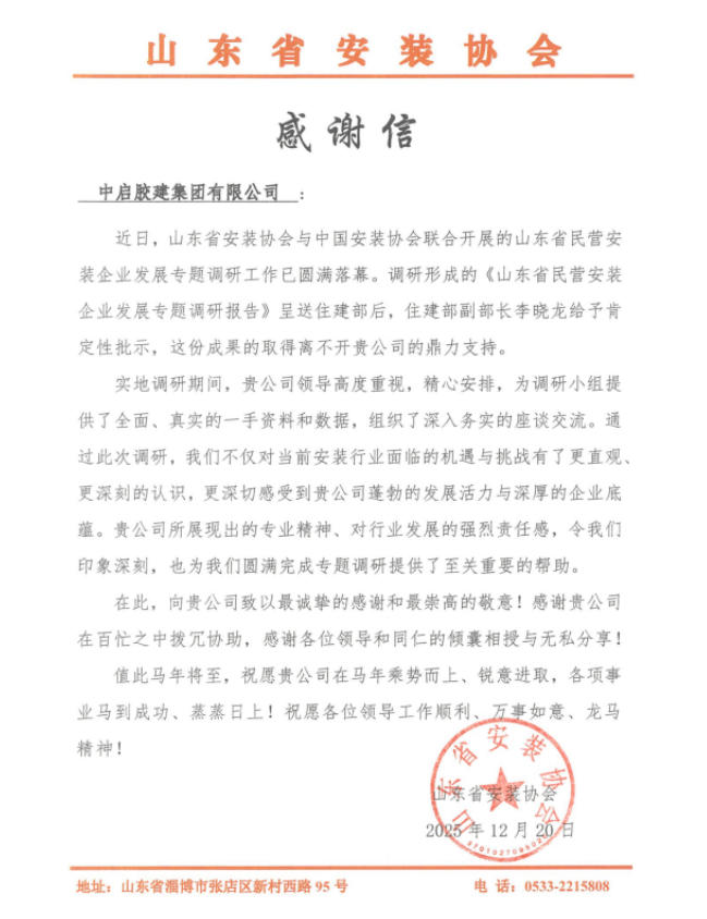 近日,集團收到山東省安裝協(xié)會發(fā)來的感謝信,對我司在山東省民營安裝企業(yè)發(fā)展專題調(diào)研中的鼎力支持致以誠摯感謝與崇高敬意。