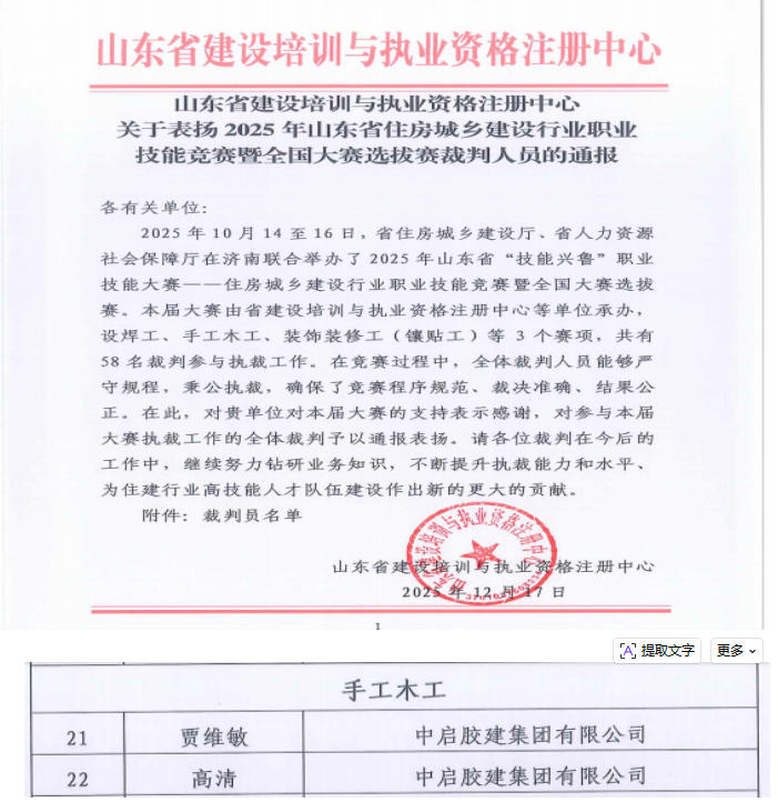 近日,山東省建設(shè)培訓與執(zhí)業(yè)資格注冊中心發(fā)布通報,對參與2025年山東省“技能興魯”職業(yè)技能大賽——住房城鄉(xiāng)建設(shè)行業(yè)職業(yè)技能競賽暨全國大賽選拔賽的裁判人員予以通報表揚。集團職工賈維敏、高清名列其中,展現(xiàn)了集團職工精湛的專業(yè)素養(yǎng)和公正嚴謹?shù)膱?zhí)裁風采。