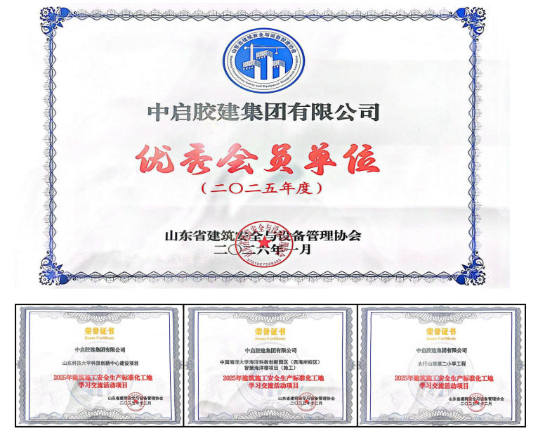 2026年1月27日,在山東省建筑安全與設(shè)備管理協(xié)會五屆四次理事會議上。公司憑借其在建筑安全生產(chǎn)管理與標準化實踐等方面的卓越成效,榮獲協(xié)會頒發(fā)的“2025年度優(yōu)秀會員單位”,同時,公司承建的中國海洋大學(xué)海洋科教創(chuàng)新園區(qū)(西海岸校區(qū))智慧海洋樓項目、山東科技大學(xué)科技創(chuàng)新中心建設(shè)項目、太行山路第二小學(xué)工程項目被評為“2025年建筑施工安全生產(chǎn)標準化工地學(xué)習(xí)交流活動項目”,贏得了與會領(lǐng)導(dǎo)、專家及同業(yè)代表的高度贊譽。
